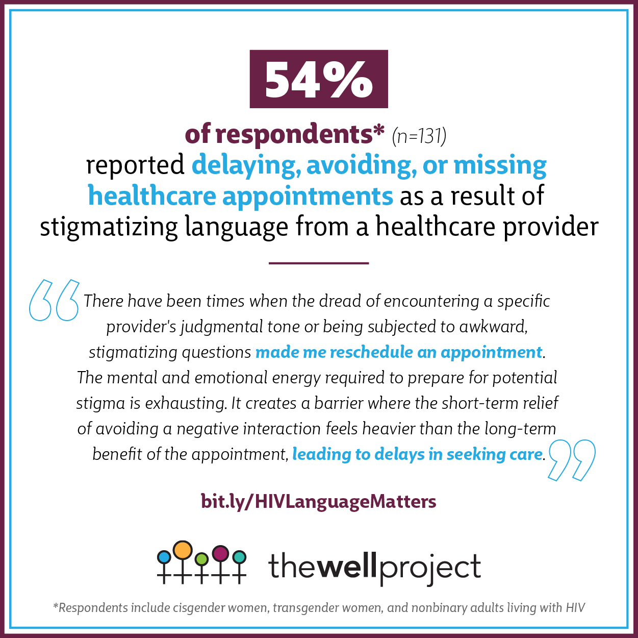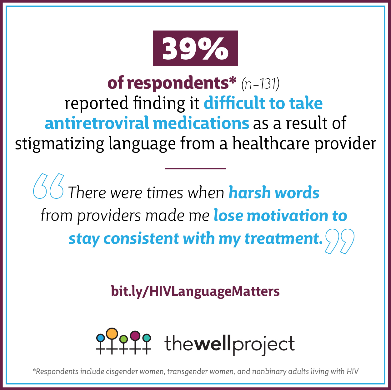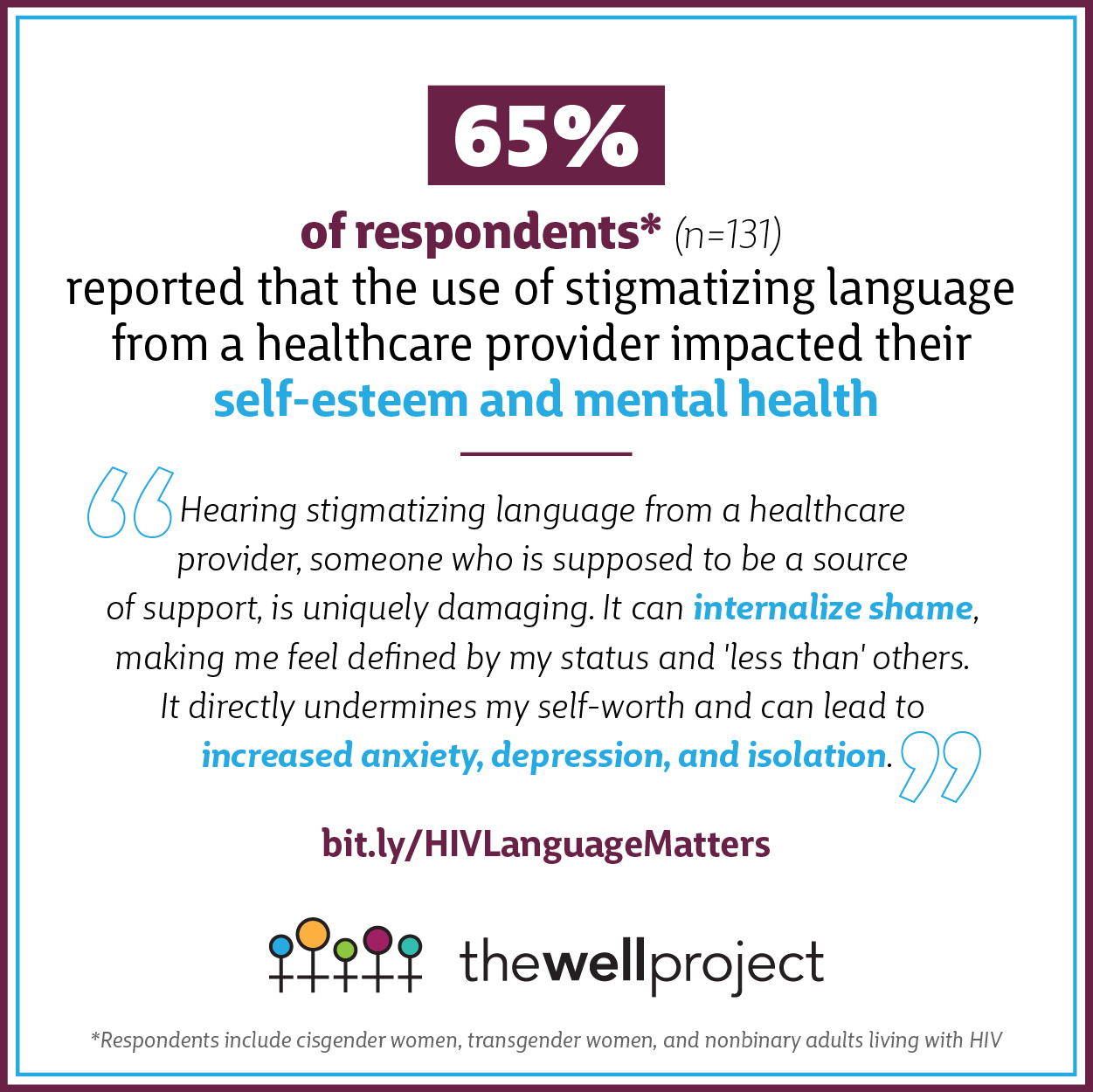 Stigmatizing language in healthcare settings has been widely documented as a barrier to care and contributes to negative health outcomes and well-being among people living with HIV. Language reinforcing stereotypes or implying blame can reduce care engagement, increase internalized stigma, and negatively impact mental health. The Well Project sought to understand the extent to which cisgender and transgender women and nonbinary adults living with HIV experience stigmatizing language and the impact of stigmatizing language on the individual.